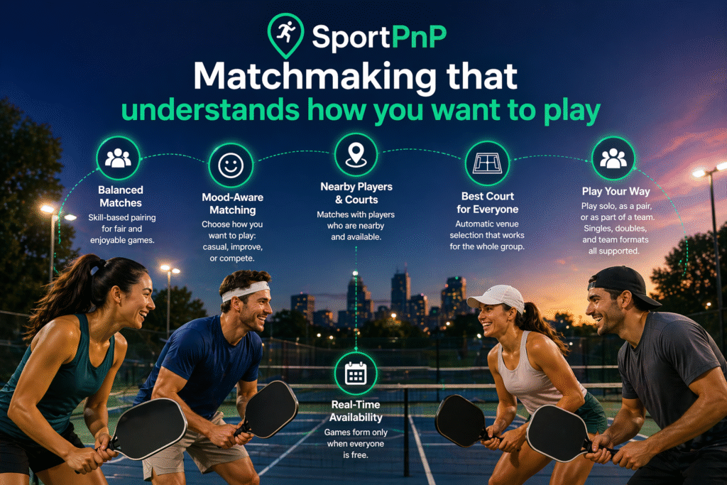 Most matchmaking systems only look at skill. SportPnP goes further: we also consider how you want to feel and play in the moment.